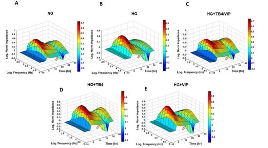 Cell migration/electroporation wounding of HUCLs monitored by real-time bioimpedance analysis using an AC frequency scan. HUCLs were seeded (60,000 cells/well) on a 96W1+ ECIS array. 3D representation of the log-normalized impedance (x-axis) as a function of the log frequency of both AC (y-axis) and time (z-axis). Cells maintained in NG (A), HG (B), HG + Tβ4/VIP (C), HG + Tβ4 (D), and HG + VIP (E) are represented. Wound induction is denoted by the red arrow. Dark red peaks reflect a media change. Time = 0 denotes time of inoculation. Log-normalized impedance values are also represented by the color bar.
