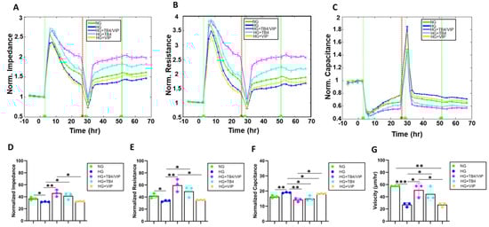 To further assess the wound healing response of HUCLs maintained in HG and the therapeutic effects of the combination Tβ4/VIP treatment, normalized impedance, resistance, capacitance, and wound velocity were determined (Figure 5A–G). HG conditions significantly reduced both impedance (A,D) and resistance (B,E) after wounding compared with NG conditions, while capacitance (C,F) was significantly elevated. In addition, the cell velocity (G) was significantly reduced following wounding of HUCLs maintained in HG compared with those in NG.