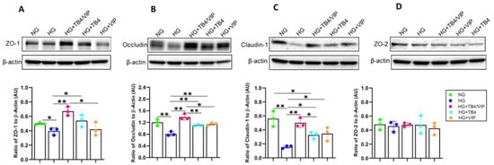 As an extension of the ECIS study, alterations in tight junction proteins ZO-1, ZO-2, claudin-1, and occludin were also determined. As shown in Figure 6, protein levels for ZO-1 (A), occludin (B), and claudin-1 (C) were significantly reduced in HUCLs maintained under HG compared with those under NG conditions. Remarkably, Tβ4/VIP significantly upregulated all three molecules compared with HG-treated cells. Somewhat unexpectedly, the Tβ4 monotherapy also resulted in a significant increase in ZO-1, occludin, and claudin-1, while the VIP monotherapy significantly upregulated levels of occludin and claudin-1 compared with HG. No effects were observed between any of the groups regarding ZO-2. Taken together, these results reveal that Tβ4/VIP treatment is a more efficacious therapy than either single-peptide monotherapy, which strongly suggests that Tβ4 works synergistically with VIP to enhance the observed functional effect.
