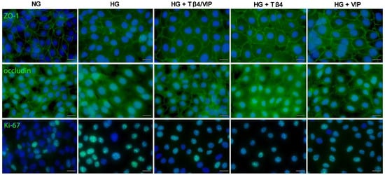 IHC was carried out to detect ZO-1 and occludin expression in HUCLs maintained in either NG or HG ± Tβ4/VIP treatments (Figure 7). Under NG conditions, ZO-1 staining (top row) presented specifically along the border of each cell, highlighting the cobblestone-like appearance of epithelial cells. There were no observable gaps or indications of membrane swelling. Occludin staining (middle row) displayed a similar pattern under NG conditions. There was positive staining along the plasma membrane, reflecting that occludin is localized to the intercellular junctional complexes. While it is mainly localized at tight junctions, some positive staining was observed intracellularly. Both ZO-1 and occludin staining intensities were lower in HUCLs maintained in HG compared with those in NG. The continuous linear pattern of ZO-1 and occludin staining associated with intercellular junctional complexes appears to be markedly reduced with HG exposure. Single channel images are available as Supplementary Material (Figure S1).