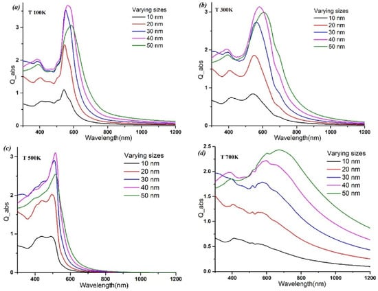 Absorption LSPR peak spectra as a function of wavelength of varying Au nanospheres at different temperatures in water embedded medium (n = 1.33) [].
