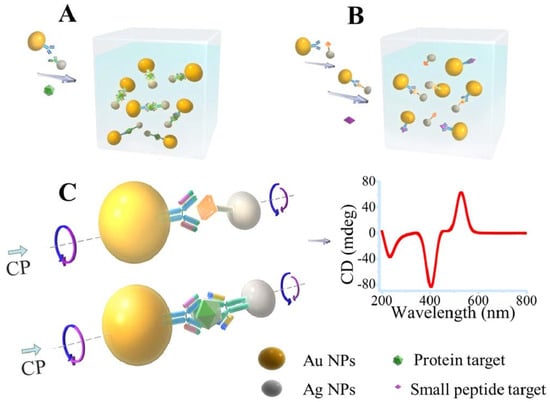 (A) The nanoparticle dimer was assembled from Au NPs and Ag NPs, which were functionalized with complementary biomacromolecules. (B) For the detection of small peptides, exemplified by microcystin-LR, the competitive immunorecognition assay was chosen to demonstrate its applicability to biological analysis. It results in a decrease of the CD amplitude. (C) For detection of the fairly large proteins exemplified by PSA, we used sandwich immunoassay mode. Schematics of the nanoparticle dimers bridged by immunocomplexes were used in competitive and sandwich immunoassays [].