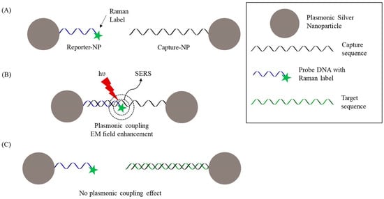 Schematic showing functionalized silver NPs and the detection mechanism of the PCI strategy. (A) Capture-NPs and Raman-labeled reporter-NPs are synthesized by functionalizing AgNPs with thiolated complementary DNA probes. (B) Plasmonic coupling is induced in a three-dimensional nanonetwork cross-linked by capture/reporter DNA duplexes that have the Raman label located between adjacent nanoparticles. (C) In the presence of target strands, targets compete with reporter-NPs for binding to capture-NPs, thereby preventing the formation of nanonetworks, leading to a significantly reduced plasmonic coupling effect [].
