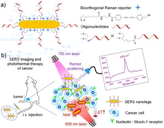 (a) Fabrication of oligonucleotide-modified bioorthogonal SERS nanotags. (b) Bioorthogonal SERS nanotags as a precision theranostic platform for cancer detection and photothermal therapy in mice after intravenous injection [].