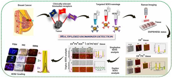 Raman spectroscopy-driven histopathologic approach was evolved for clinical diagnostics utilizing targeted Raman-label–SERS (RL-SERS)-nanotags which ensure a rapid, sensitive, and accurate multiplexed detection of clinically relevant breast cancer biomarkers, ER, PR, and HER2, in single tissue specimen by the marked signature Raman fingerprint resembling the corresponding biomarker [].