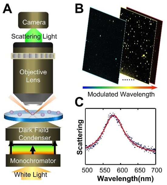 (A) Schematic graph of the home-built DFM. (B) The recorded images at different illumination wavelengths are combined into an image series. (C) Scattering spectra of one randomly selected particle [].