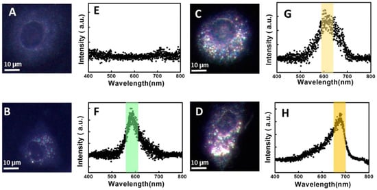 Hyperspectral dark-field microscopy (HSDFM) combines spectroscopy and microscopy for both molecular and spatial information. Analyzing the full spectral data enables multiplexed quantification of multiple targets labeled with different colored nanoparticles. Advanced machine learning algorithms can be applied to spectral scatter fingerprints for automated classification of normal versus cancerous cells or tissues. For example, Bhat et al. [] utilized HSDFM to investigate the interactions between 10 nm AuNPs or AgNPs and giant unilamellar vesicles (GUVs) made of the lipid dimyristoyl phosphatidylcholine (DMPC). GUVs were doped with varying concentrations of cholesterol to mimic mammalian cell membranes. The goal was to understand the physicochemical mechanisms governing AuNP and AgNP interactions with model cell membranes, which could inform their development for cancer targeting and treatment. As shown in Figure 11, AuNPs integrated into the lipid bilayer of the GUVs and formed a uniform golden-brown crust, suggesting AuNPs are highly disruptive to membrane integrity. In contrast, AgNPs interacted less disruptively, binding to the GUV surface as isolated particles or clusters with varied configurations. GUVs with 20% cholesterol content were optimal, exhibiting the greatest membrane integrity and lowest permeability. This aligns with other research showing that 20% cholesterol maximizes liquid-ordered domain formation critical for proper membrane function. The distinct mechanisms of AuNP and AgNP interaction with membranes could enable the selective targeting of cancerous vs. normal cells. AuNPs may permeabilize cancer cell membranes more readily due to aberrant lipid content, such as lower cholesterol. Cui et al. [] demonstrated the use of HSDFM for analyzing individual cells. The authors developed a simple two-step method involving delipidation followed by refractive index matching to reduce intracellular light scattering and enhance the signal from nanoparticle probes. They found that lipid-rich organelles, such as endosomes and lysosomes, caused strong background scattering that obscured signals from plasmonic nanoparticles used to label targets. By first treating cells with isopropyl alcohol to extract lipids, these scattering structures were effectively removed. Subsequent immersion in ScaleA2 solution homogenized the refractive index throughout the cell to 1.39, further reducing scattering noise. Theoretical modeling showed optical clearing suppresses scattering from organelles while boosting signals from AuNPs, improving the signal-to-noise ratio. Experiments verified that this new clearing protocol significantly lowered scattering compared to other agents, enabling sensitive nanoparticle-based HSDFM imaging. The authors demonstrated high-resolution quantification and localization of receptors and mRNAs in single cancer cells. They also monitored intracellular AuNP growth dynamics with unprecedented spatiotemporal resolution. Simultaneously imaging multiple cell receptors can also be achieved using HSDFM []. The authors develop a multiplexed imaging system to analyze the immunophenotype of cells by detecting three commonly overexpressed cancer cell receptors—EGFR, IGF-1R, and HER-2. The authors chose AuNRs, Au nanospheres, and Ag nanospheres due to their distinct scattering spectra when imaged with hyperspectral microscopy. By conjugating antibodies specific to each receptor to one nanoparticle type, they created a system of molecular tags that could be imaged in one experiment. Experiments on cells with varying receptor expression demonstrated the specificity of each nanoparticle tag for its target receptor. Using single, double, and triple-labeled cells, the authors showed the ability to simultaneously detect the presence of the different receptors. This allowed for the determination of the immunophenotype of cell lines based on the combination of receptors detected.