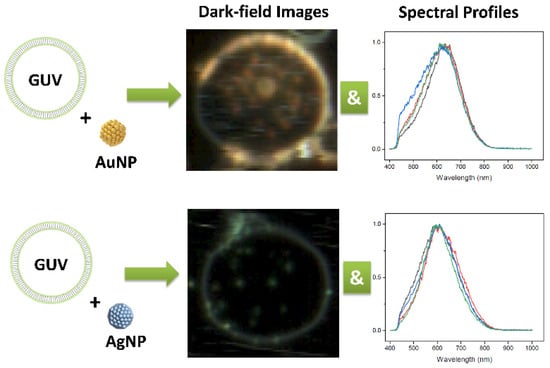 - Bhat, A.; Huan, K.; Cooks, T.; Boukari, H.; Lu, Q. Probing Interactions between AuNPs/AgNPs and Giant Unilamellar Vesicles (GUVs) Using Hyperspectral Dark-Field Microscopy. Int. J. Mol. Sci. 2018, 19, 1014. [Google Scholar] [CrossRef]