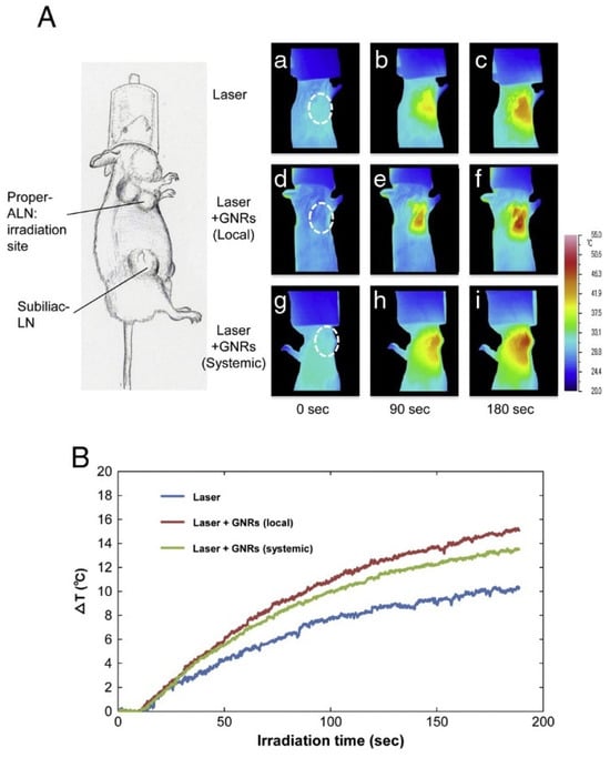 The real-time image-guided photothermal therapy of tumors has been demonstrated by leveraging the intrinsic thermal ablation capabilities of irradiated nanoparticles localized in cancerous tissues. Combining photothermal imaging and therapy (“theranostics”) in a single platform is a promising strategy for personalized nanomedicine approaches []. Photothermal nanoparticles are also being evaluated for aiding surgical resection and adjuvant treatment by marking lymph node metastases with near-infrared imaging and destroying residual cancer cells via hyperthermia []. Figure 14A shows representative thermal images of lymph nodes with tumors. The local temperature rise caused by laser irradiation was further increased when AuNRs were administered. The local injection of AuNRs into the tumor site was slightly more effective at raising the temperature than systemic GNR delivery. Figure 14B shows the maximum temperature increase from the baseline of 36 °C. After 3 min of laser irradiation alone, the temperature reached 46 °C. With the addition of AuNRs delivered locally, the temperature rose to 51 °C. Systemic AuNR delivery combined with laser irradiation resulted in a temperature of 50 °C after 3 min.