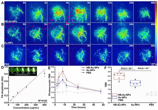 Photoacoustic tomography. In vivo images of human xenograft tumors implanted in mice are shown between 0 and 48 h post-injection of (A) HB-AuNPs, (B) AuNPs, and (C) PBS. (D) The in vitro photoacoustic intensity increases linearly with concentration of HB-AuNPs. (E) Quantified intensities from the tumors show a peak T/B ratio of 3.08 ± 0.37 and 2.27 ± 0.31 at 8 h post-injection for HB-AuNPs and AuNPs, respectively. (F) The mean value for HB-AuNPs is significantly greater than that for either AuNPs or PBS in n = six animals, p = 2.4 × 10−3, and 2.6 × 10−7, respectively, by unpaired t-test [].
