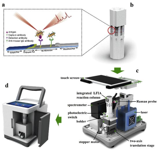 Schematic of portable SERS-based LFIA reader. (a) LFIA strip and (b) integrated reaction column. (c) Details of SERS-based LFIA reader and (d) the entire portable reader [].