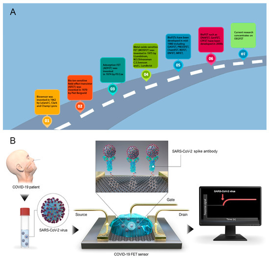 (A) A roadmap describing the progress in the development of field-effect transistor-based biosensors [54,55,56,57,58]; (B) Architecture of the representative FET biosensor [59].