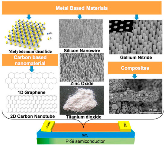 To manufacture a FET biosensor, a wide range of nanomaterials has been applied, namely, oxides [44,45], carbon [47,60], conductive polymers [61,62], and composites [63,64] with diverse morphologies, such as nanoparticles [65], nanorods [66], 2D nanosheets [47], nanotubes [67,68], and nanowires [69] due to their high surface area to volume ratio, which is beneficial for immobilizing a large number of biological receptors, as illustrated in Figure 2. The existence of immobilized receptors in the device enables FET biosensors to recognize biomarkers, namely, prostate-specific antigens [70,71], antibiotics [72,73], bacteria [74,75], and viruses [76,77,78], with high sensitivity and selectivity. FET biosensors are classified into n- and p-type devices based on the type of semiconductor used for channel fabrication [79,80]. Many advanced techniques have been widely applied to transfer materials to the sensing area of devices, such as chemical vapor deposition (CVD) [81,82], atomic layer deposition (ALD) [83,84], spin coating [85], photolithography [9,39], and Langmuir–Blodgett (LB).