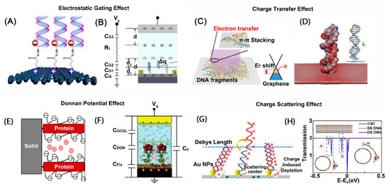 Illustration of different sensing mechanisms of graphene-based FET biosensor [107]: (A,B) Electrostatic gating effect; (C,D) Charge transfer effect; (E,F) Donnan potential effect; (G,H) Charge scattering effect.