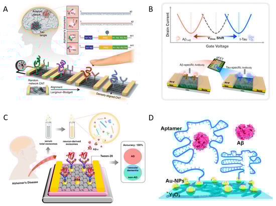 - Chen, H.; Xiao, M.; He, J.; Zhang, Y.; Liang, Y.; Liu, H.; Zhang, Z. Aptamer-Functionalized Carbon Nanotube Field-Effect Transistor Biosensors for Alzheimer’s Disease Serum Biomarker Detection. ACS Sens. 2022, 7, 2075–2083. [Google Scholar] [CrossRef]