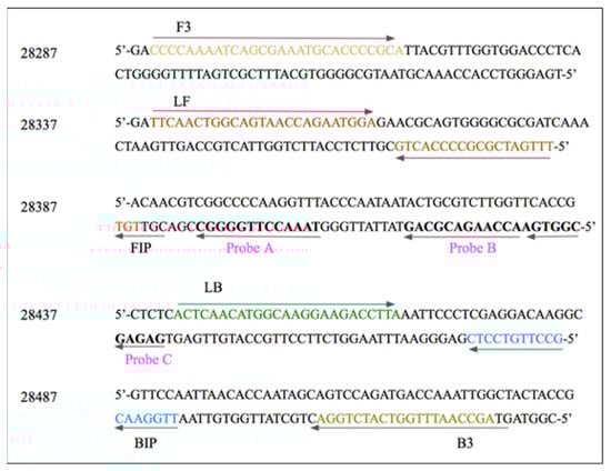 LAMP primer design and probe design for the N-gene (466 bp) of SARS-CoV-2. Six LAMP primers are designed to amplify 200 bp of the gene. The six primers are: forward outer loop primer (F3), backward outer loop primer (B3), loop-forming forward primer (LF), loop-forming backward primer (LB), forward inner primer (FIP), and backward inner primer (BIP). The three probes were devised in such a manner that there is no overlap with the primer sequences, and the probes could be uniquely determined. The probe design enabled biotin incorporation into the LAMP amplicon and eventually produced a bi-labelled LAMP product.