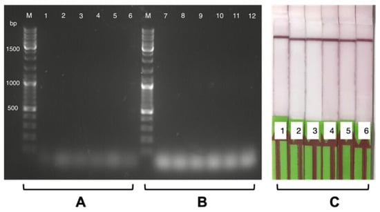 RT-LAMP for SARS-CoV-2 negative swab samples in 20 min of processing time. RT-LAMP results were read out on 1.5% agarose gel, and the gel image shows six RT-LAMP amplicon results before and after biotinylated-probe hybridization: two NTC and four negative samples. (A) RT-LAMP results before biotinylated-probe hybridization: firstly, the M-100 bp DNA marker; then, the NTC duplicate in lanes 1 and 2; lanes 3 to 6 are RT-LAMP amplicons of 4 different negative swab samples. (B) RT-LAMP results after biotinylated-probe hybridization: firstly, the M-100 bp DNA marker; then, the NTC duplicate with all biotinylated probes A, B, and C in lanes 7 and 8; lanes 9 to 12 are RT-LAMP amplicons of four different negative swab samples with all biotinylated probes A, B, and C. (C) LFA readout for the bi-labelled RT-LAMP amplicon: LFA 1 and 2 NTC duplicates with all biotinylated probes A, B, and C, and LFA 3 to 6 are RT-LAMP amplicons of 4 different negative swab samples with all biotinylated probes ABC.