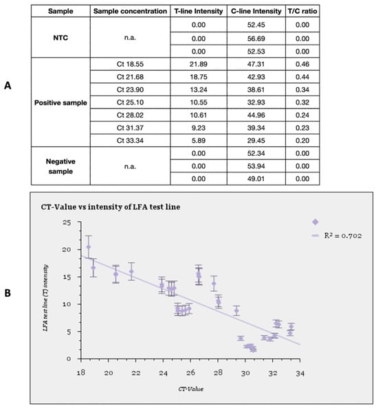 A smartphone-based in vitro diagnostic (IVD) device, which measures the relative intensity of the test band and control band on the LFA, was customised for our LFA setup (see Section 2.6). The relative intensity readout was recorded for 44 LFA results within the Ct value range of 18 to 33 (see Figure 7A). The test band intensity was visually observed to relate to the Ct value. Characteristically, the higher the Ct value of the SARS-CoV-2 positive swab sample, the lower the viral load in the sample and the lower the LFA test line intensity. Therefore, the T-line intensity was also inversely proportional to the Ct values obtained through qRT-PCR. The visual hypothesis was confirmed when a linear (negative) correlation with the regression coefficient R2 = 0.702 (see Figure 7B) was observed. Such correlations between test band intensities and Ct values aim towards a semi-quantitative result readout using the RT-LAMP-LFA technique.