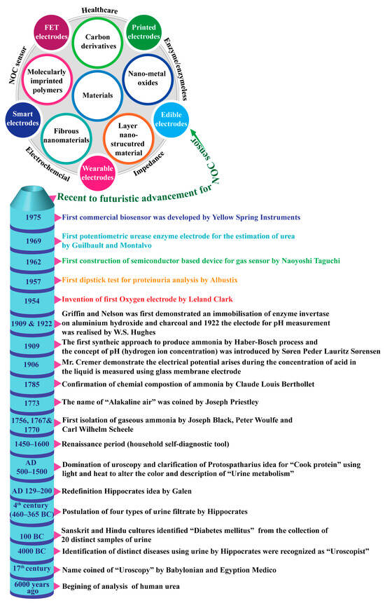Over 6000 years ago, diagnostics were first used as an element of laboratory practice. Urine is an inexpensive source for finding nitrogen-containing organic compounds (NOCs) and demonstrates their potential correlation with various illnesses. This excretory biofluid was a primary diagnostic tool in ancient eras and was considered a “divine fluid” by physicians. Babylonian and Egyptian medicos coined the word “uroscopy”, which was derived from the Greek “ouron” (i.e., denoting “urine”) and “skopeo” (i.e., denoting “examine or inspect”). In 100 B.C., Sanskrit and Hindu cultures classified urine into twenty distinct types based on its color, and it was further named by its sweet taste in a special case called diabetes mellitus [1]. In the 4th century B.C. (460–365), Hippocrates found the presence of filtrates, such as blood, phlegm, and yellow and black bile, in urine [2]. The predominant theory of Hippocrates’ ideas were further redefined precisely by Galen (AD 129–200), followed by a redefinition in the Middle Ages (AD 500–1500), whereby uroscopy played a vital role in all the stages of disease identification [3,4,5]. Then, in the Renaissance period (AD 1450–1600), uroscopy was developed as a household self-diagnostic tool for monitoring health conditions. Nevertheless, ancient techniques of diagnosis with urine are not practiced nowadays, yet urine remains an effective tool for the early detection of diseases in the modern world [4]. Figure 1 shows the historical evidence related to the conceptualization, differentiation, and development of nanomaterials for the detection of nitrogen-containing organic compounds.