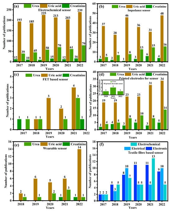 In recent decades, the sustainable economic progress of public health has been dependent on the advancement of science and technology. Therefore, the scientific community has predicted the necessities for the development of effective ideal materials, methodologies, and technology transfers. Despite this, researchers are facing many challenges in treating various illnesses (i.e., cancer, diabetes, neurological dysfunction and/or disorder, etc.), managing food safety and quality, and environmental remediation. Typically, nitrogen-containing organic compounds (NOC) (i.e., urea, uric acid, and creatinine) are naturally found in biofluids such as blood, urine, saliva, and sweat [6]. These NOCs are effectively filtered through the kidneys and liver while also being discreetly filtered through the biodegradation of food as well as environmental systems [7]. In addition, the determination of NOCs is an important biomarker for clinical diagnosis and socio-environmental monitoring [8]. Particularly in clinical diagnosis, urine and blood are considered precious tools for identifying liver and kidney function, urinary tract obstruction, heart failure, catabolism of proteins, and even shock and stress [9]. Table 1 and Table 2 show the normal NOC levels of urea, uric acid, and creatinine in biofluid. Increasing or decreasing NOC levels can cause various illnesses. Therefore, extensive research on NOCs poses great challenges in terms of precise determination via analytical methods, even in the presence of complex metabolites at a lower concentration. Of these, an enormous number of conventional methods are being used to identify NOCs, including solid-phase extraction (SPE), ultraviolet-visible (UV-visible) spectroscopy, infrared (IR) spectroscopy, flow injection, chromatography techniques coupled with mass spectrometry, fluorimetry, and surface plasmon resonance (SPR) techniques [10,11,12,13]. Furthermore, these methods necessitate sophisticated instrumentation, trained individuals, a time-consuming process, pre-sample preparation, etc. Despite this, electrochemical/electroanalytic techniques have shown promise for direct and indirect quantitative and qualitative determination of NOCs, with good sensitivity, selectivity, a rapid response, and feasible economic viability [14,15]. This is due to the fact that biochemical events are converted into electrical signals through the electrochemical biosensor, which is a typical sensing device. Generally, electrochemical techniques have been recognized based on their operational conditions, such as amperometry (i–t), differential pulse voltammetry (DPV), linear pulse voltammetry (LSV), square wave voltammetry (SWV), the current-potential (I–V), and electrochemical impedimetric spectroscopy (EIS). Of these, the EIS method is a quick, non-destructive technique that has recently been used to determine NOCs. Briefly, the EIS involves applying an alternating current at various frequencies to the sample, followed by measuring the impedance response from the sample as a function of frequency. Rather than conventional techniques, the affordable technique of voltametric measurement has been used to determine the redox potential, whereas the potentiometric method is employed to measure precision, selectivity, and sensitivity. Figure 2 depicts the Scopus index bar chart on the number of research publications based on NOC biomarker detection from the period from 2017 to 2022 and towards the future innovation and sustainable development of wearable devices.