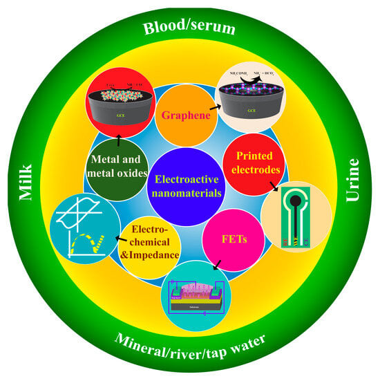 Electrochemical methods are used to determine NOC levels in serum, blood, sweat, and urine, and are of great interest to researchers due to their rapid accessibility. In principle, it is necessary to detect NOC levels via either enzymatic or non-enzymatic electrochemical methods. Furthermore, the enzymatic electroanalytical technique is an indirect method that uses enzymes (i.e., urease), which is referred to as an “enzymatic electrochemical sensor”, and vice versa for the non-enzymatic method. These enzymatic or non-enzymatic electroanalytical sensors have certain inevitable drawbacks, as follows: immobilization of enzymes; expensive enzyme; incompetent reproducibility; and limited concentration, temperature, pH, and humidity conditions [10,23,24,25,26,27,28]. On the other hand, development of biomedical devices for rapid, sensitive, and specific detection of biomarker species has been facilitated by the emerging field of nanomaterials and nanofabrication technology. Indeed, the construction and development of integrated nanosensors for the simultaneous detection of a variety of target analytes will remain a major task on the frontier of nanotechnology [29]. Therefore, the state-of-the-art technology in the manufacture of nano-based devices pays great attention to real-time applications, especially in on-site health monitoring products. The characteristics of mesostructured or composite/hybrid nanostructures are distinctly different from those of conventional bulk materials. Usually, the surfaces of a nanoengineered smart material would have been changed to include functionalities that create binding sites for biomolecules [30]. Then, these nanomaterials were found to have many uses, especially in the development of direct or indirect electrochemical biosensing devices, which are used to measure NOCs at ultra-low concentrations using very small volumes of different clinical samples (i.e., biofluids). Furthermore, the qualitative and quantitative estimation of NOCs has gained immense importance as it offers early diagnosis of several diseases like renal insufficiency, hyperpyrexia, hyperthyroidism, leukemia, diarrheal diseases, diabetes mellitus, and so on [22,31,32]. So, in this review, we have summarized the recent advances in NOC biomarker detection methods through direct or indirect electrochemical and impedimetric-based sensing methods. A wide range of metal oxide nanoparticles and two-dimensional (2D) materials and their nanocomposites have seen considerable progress in their preparation, processing, characterization, and potential applications (Figure 3). In addition, nanofabrication of devices like FETs and printed electronics has resulted in improvements in their performance. Consequently, it is possible to introduce new opportunities in the development of nanoscale devices and make them economically scalable for next-generation sensors, not only biosensors but also sensors in food and environmental monitoring.
