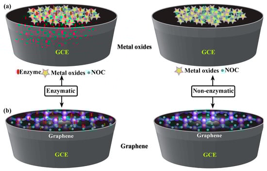 Schematic illustration of the development of (a) metal oxides and (b) two-dimensional nanomaterials on GCE for the detection of NOCs with enzymatic and enzyme-free methods.