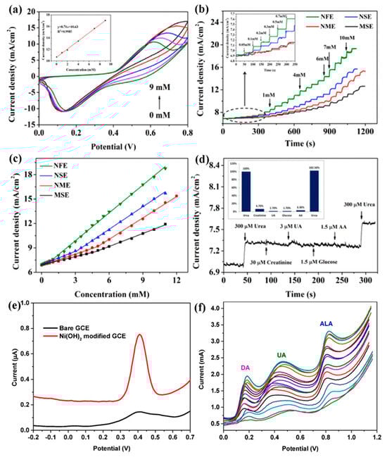 CV profiles of the prepared Ni-P paper electrode (a) at different concentrations of urea with a scan rate of 5 mV/s; inset is the plot of oxidation peak currents vs. concentrations of urea, (b) amperometric responses of four Ni-P paper electrodes against successive injections of urea, (c) calibration curve vs. urea concentrations corresponding to the responses, (d) current response to the addition of urea and different interfering species. Reprinted with permission from reference [50] and the corresponding copyright is 2019 Elsevier, (e) DPV curve showing the current obtained with bare GCE and Ni(OH)2 modified GCE as the working electrode in a 1 mM solution of UA, and (f) DPV curves of Ni(OH)2 nanosheets for simultaneous detection of UA at different concentrations. Reprinted with permission from reference [56] and the corresponding copyright is 2022 Elsevier.