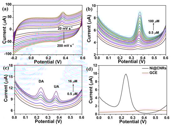 CV curves of Ni@CNRs@GCE with (a) 100 μM UA with different scan rates, (b) DPV curves with different concentrations, (c) simultaneous detection of UA with different concentrations, and (d) 100 μM UA. Reprinted with permission from reference [65] and the corresponding copyright is 2021 Elsevier.