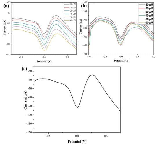 DPV of Ni/RGO/CCF (a) at different concentrations of UA, (b) on a real sample of human sweat with known urea concentrations, and (c) with UA in 20 μL sweat. Reprinted with permission from reference [66] and the corresponding copyright is 2022 Elsevier.