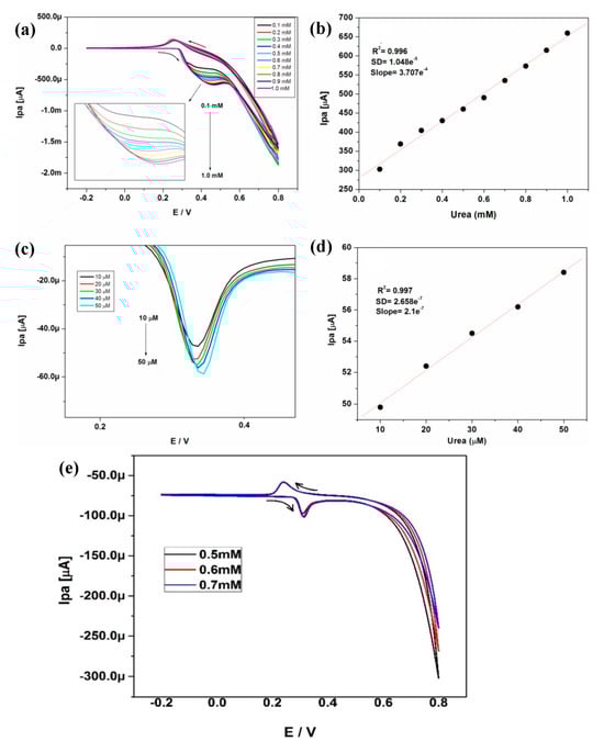 (a) CV curve for various urea concentrations (0.1–1.0 mM) detected using NiS/GO/MGCE, (b) anodic peak current against concentration, (c) DPV curve for urea at different concentrations (10–50 μM), (d) anodic peak current against concentration, and (e) CV curve of a milk sample spiked with different concentrations of urea on NiS/GO/MGCE. Reprinted with permission from reference [67] and the corresponding copyright is 2020 Elsevier.