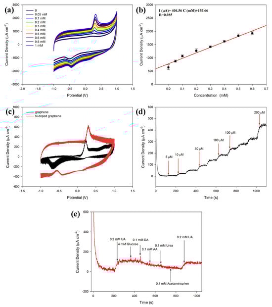 (a) CV curve of the N-doped graphene electrode at different concentrations of UA, (b) linear fit of current vs. concentration of UA, (c) CV curve of the neat graphene and N-doped graphene electrodes after subtracting the background in 0.1 M phosphate buffer (PB) containing 0.2 mM UA, (d) amperometric response of the N-doped graphene modified electrode with subsequent infusion of various concentrations of UA, and (e) amperometric response of the N-doped graphene electrode toward UA under the effect of different interferents. Reprinted with permission from reference [72] and the corresponding copyright is 2018 Elsevier.