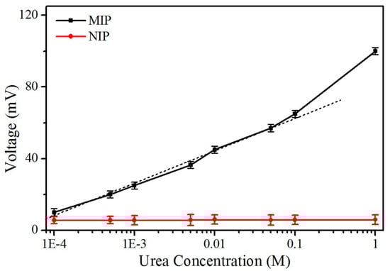 Voltage response of MIP (black line) and NIP (red line) modified ISFET sensors in different urea concentrations (the dotted line is the trend line). Reprinted with permission from reference [80] and the corresponding copyright is 2016 Elsevier.