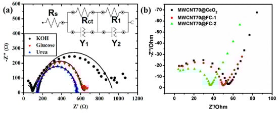 Electrochemical impedimetric spectroscopy (EIS) [93] can sensitively monitor changes caused by capacitance or charge transfer resistance during the specific binding of targeted elements [94]. As per the operational principle and mechanism of the measurement, EIS instruments have been differentiated into two types: non-faradaic EIS (i.e., impedimetric transducers) and faradaic EIS (i.e., amperometric and potentiometric transducers). First, the non-faradaic EIS is a non-destructive method as it favors persistent measurement on the same samples. EIS is also performed at various frequency ranges, and it is highly sensitive to even very small changes in the measurement [93,95]. The EIS analysis does not involve any redox reaction and there is no need for direct current or a reference electrode, whereas the faradaic EIS is very focused on electrochemical reactions and provides specific information that does not require multiple frequency sweeps and results in rapid (i.e., less time-consuming) measurements. Faradaic EIS approaches can be employed wherever non-destructive measures are not a priority. So, non-faradaic and faradaic EIS-based detections are more amenable to fabricating a miniaturized kit, in terms of sensitivity, data complexity, and a non-destructive nature [96,97]. Recently, Tammam, R. H. and Saleh, M. M., synthesized a different weight percentage of NiOx on GCE and measured it in an alkaline medium. The fitted Randles equivalent circuit reveals a double-layer capacitor (Cdl) due to the inhomogeneity and roughness on the surface of the electrode. This capacitor’s presence can be attributed to the increase in the concentration of Ni(OH)2 and NiOOH with the increase in the loading percentage. However, Rct decreases due to the faster charge transfer of the redox couple of Ni(OH)2/NiOOH, thus converting the fraction of the α-Ni(OH)2 species to β-Ni(OH)2. Further, this conversion inhibits the diffusion of -OH ions onto the electrode surface. Then, upon increasing the urea concentration, the Rct decreases, which may be attributed to an increase in the charge transfer kinetic due to the higher electrocatalytic oxidation of urea. At higher urea concentrations, the oxidation of Ni (II) to Ni (III) is accelerated. Hence, Ni (III) is removed by urea, which enhances further conversion of Ni (II) to Ni (III), resulting in an increased charge transfer rate caused by the conversion of the OH− ions to CO32− ions and a CO2 byproduct [51]. Goda, M.A. et al. demonstrated the Rct measurement for the NiOx/CuOx/PANI/GC electrode during the electrocatalytic oxidation of urea. The fabricated catalyst exhibits a significant decrease in Rct, indicating faster charge transfer of NiOx/CuOx/PANI/GC catalysts due to their higher electrocatalytic performance. This may be due to the conductivity contribution of the PANI polymer layer beneath the bimetallic catalyst layer [54]. Salarizadeh, N. et al. developed a NiO-MoO3 on GCE, and the EIS results indicate that the Rct value is lower than that of the bare GCE in the presence of urea (Figure 13a). As a result, there was a growth in the reaction rate at the electrode interface. Thus, the decrease in Rct value significantly proves the electroactivity of the developed electrode for the oxidation and enzyme-free detection of urea [98]. Then, electrospun ferric ceria nanofibers were mixed with MWCNTs coated on the surface of GCE by Shekh, M.I. et al. The Rct value was estimated for the MWCNT70@CeO2, MWCNT70@FC-1, and MWCNT70@FC-2 tested in the presence of uric acid. Amongst these materials, MWCNT70@FC-2 attained the lowest Rct value for the detection and oxidation of uric acid (Figure 13b). This lowest value is because of the sufficient weight percentage of MWCNT (i.e., 70%) and Fe3+ (i.e., 30%) leading to exceptional electrocatalytic performance for the detection of uric acid [99]. Albaqami, M.D. and his colleagues grew Co3O4 nanowires on cotton silk. Then, they drop-casted uricase onto the Co3O4 nanostructures on the GCE surface. This fabricated electrode was used to detect uric acid. The fabricated electrode exhibits a higher charge transfer rate, and a small, semicircular Nyquist’s plot of the electrode shows that the nanowires provide a better measurable electrical signal than that of a platelet-like nanostructure. However, immobilization of uricase can slightly influence impedimetrics due to its insulating features in the presence of an enzyme. Hence, the researchers suggested that the proposed nanowire be used for the determination of uric acid because the cotton silk acts as a co-catalyst to boost the electroactive behavior [100].