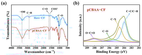 (a) The FT−IR spectra of bare−CF and pCBAA−CF; (b) representative XPS high−resolution C1s spectra of pCBAA−CF.