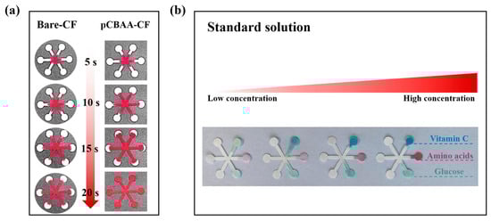 (a) Time dependence of red ink flow rate on bare-CF and pCBAA-CF; (b) gradient sensing performance of glucose, amino acids, and vitamin C on pCBAA-CF.