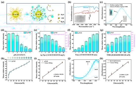 (a) Principle of glucose detection using Ch-Ag NPs; (b) FTIR spectrum of Ch-Ag NPs and chitosan; (c) UV absorbance of experimental group and blank control group; (d) effect of pH on detection method; (e) effect of Ch-Ag NP concentration on enzymatic activity; (f) effect of time on reaction progress; (g) effect of TMB concentration on colorimetric reaction; (h) effect of different glucose concentrations on average grayscale intensity; (i) linear relationship between glucose concentrations and average grayscale intensity; (j) effect of different glucose concentrations on UV absorbance; (k) correlation between glucose concentration and UV absorbance.