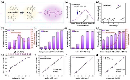 (a) Principle of free amino acid detection; (b) UV absorbance of experimental group and blank control group; (c) selective testing of detection method; (d) effect of pH on detection method; (e) effect of temperature on color reaction; (f) effect of time on reaction progress; (g) effect of ninhydrin concentration on colorimetric reaction; (h) effect of different amino acid concentrations on average grayscale intensity; (i) linear relationship between amino acid concentrations and average grayscale intensity; (j) effect of different amino acid concentrations on UV absorbance; (k) correlation between amino acid concentration and UV absorbance.