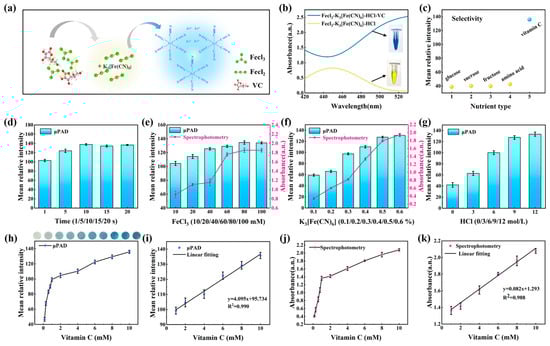 (a) Principle of vitamin C detection; (b) UV absorbance of experimental group and blank control group; (c) selective testing of detection method; (d) effect of time on reaction progress. (e) Effect of Fecl3 concentration on detection method; (f) effect of K3[Fe(CN)6] concentration on colorimetric reaction; (g) effect of HCl concentration on detection method; (h) effect of different vitamin C concentrations on average grayscale intensity; (i) linear relationship between vitamin C concentrations and average grayscale intensity; (j) effect of different vitamin C concentrations on UV absorbance; (k) correlation between vitamin C concentration and UV absorbance.