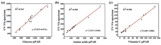 Linear regression analysis of μPAD and UV spectrophotometry. (a) Glucose; (b) amino acids; (c) vitamin C.