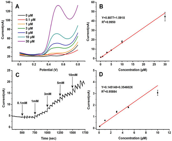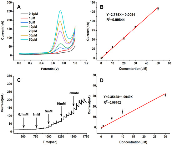(A) DPV detection curves for different SA contents obtained using the MWCNTS/CCC/Pt wire-based electrochemical microsensor. (B) Linear correlation between SA concentrations and peak currents ranging from 0.1 to 50 µM (n = 10). (C) Amperometric I-t detection curves for successive additions of 10 µL of SA at ascending concentrations of 0.1, 1, 5, 10, 30 mM, respectively, in 10 mL of 0.2 M PBS with pH 7 under the application potential of 0.75 V. (D) Linearity of peak currents with variations in SA content from 0.1 to 30 µM (n = 10).