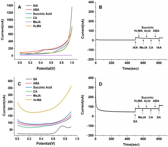 To evaluate the reproducibility of the electrochemical microsensor, ten different working electrodes were tested using DPV and amperometric I-t. The findings demonstrated that the relative standard deviation (RSD) was approximately 3.25% and 3.75% for 10 µM IAA and SA, respectively, based on DPV, and 3.49% and 4.77% based on amperometric I-t, indicating good reproducibility for IAA and SA detection. In addition, potential interferences from other plant molecules in the detection of IAA (Figure 4A) and SA (Figure 4C) were investigated. No significant interferences were observed in detecting either IAA or SA from malic acid (H2MA), citric acid (CA), methyl jasmonate (MeJA), abscisic acid (ABA), or succinic acid at a concentration of 10 µM. The interferences from these molecules in the detection of IAA (Figure 4B) and SA (Figure 4D) were also evaluated using amperometric I-t, and no interference was found in detecting either IAA or SA from H2MA, MeJA, succinic acid, CA, or ABA at a concentration of 10 µM. Based on these results, the conducting carbon cement/MWCNTS/modified Pt wire-based microsensor was used to detect IAA and SA in real samples that also contain other plant molecules.