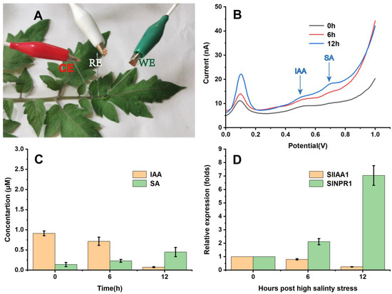 Figure 5B depicts the DPV curves for IAA and SA in tomato leaf veins under high salinity stress. Compared to the starting point (0 h), the peak response of IAA was gradually decreasing while SA was increasing in the veins of tomato under high salinity stress at 6 and 12 h, respectively. Figure 5C shows the changes in IAA and SA contents in the veins of tomato. There was no obvious change at 6 h, but a significant reduction at 12 h for IAA was observed. On the contrary, the SA content showed an increasing trend and reached significant increases at 12 h. We also analyzed the expression pattern of IAA and SA related genes’, including SlIAA1 and SlNPR1. SlIAA1 is an auxin response gene induced by IAA [41], while SlNPR1 makes a vital impact on SA signaling and is upregulated by SA [42,43]. Thus, SlIAA1 and SlNPR1 genes were used to confirm the detection results obtained in this study. Figure 5D reveals that the expression of SlIAA1 in tomato leaf veins decreased significantly under high salinity stress relative to the control (0 h), while the expression of SlNPR1 increased markedly under high salinity stress. These findings suggest that IAA levels were reduced while SA levels were elevated in tomato leaf veins under the high salinity stress. In addition, these change information of IAA and SA in tomato leaves can be used to reflect the health stage of tomato under the high salinity stress.