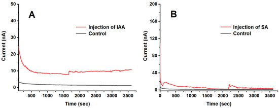 (A) The I-t detection curves of 10 µM IAA injected into the veins of tomato leaves at 1600 s (red line) and control (black line) (B) The I-t detection curves of 10 µM SA injected into the veins of tomato leaves at 1600 s (red line) and control (black line).