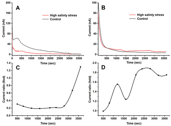 Figure 7A,B presents the dynamics of IAA and SA in tomato leaf veins after high salinity stress from 11.5 to 12.5 h. For IAA, the curves under high salinity stress exhibited no fluctuations in the peaks compared to the control (Figure 7A). The current ratios for IAA in the veins of tomato leaves under high salinity stress and the control were also analyzed (Figure 7C). The results revealed that the current ratios for IAA were less than 0.3-fold during this period, indicating IAA suppression under high salinity stress. Meanwhile, for the SA group, the curves under high salinity stress exhibited multiple fluctuations in the peaks compared to the control (Figure 7B), and the current ratios for SA were higher than 1.5-fold during this period (Figure 7D), suggesting an increase in SA under high salinity stress. The current monitoring system allows (10 µL PBS) for continuous monitoring of IAA or SA within three hours. It should be emphasized that, if SA or IAA want to be monitored for a longer period of time, more PBS will need to be added to the surface of the electrode to ensure the conductivity.