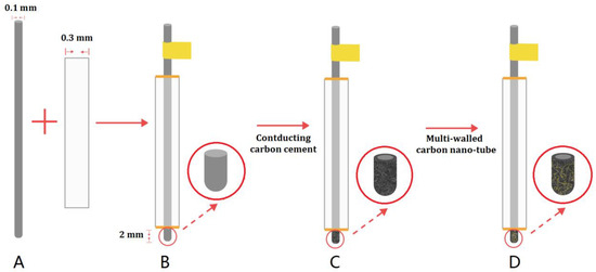 The preparation process of the electrochemical microsensor. (A) 0.1 mm bare Pt electrode; (B) the bare Pt electrode fixed in capillary; (C) the conducting carbon cement (CCC) modified bare Pt electrode; (D) the Multi-walled carbon nano-tube(MWCNTS)/conducting carbon cement modified bare Pt electrode (MWCNTS/CCC/Pt).