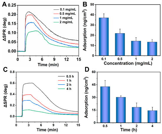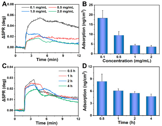Figure 3. SPR spectrogram monitoring of PTB-modified surfaces with different concentrations against lysozyme adsorption (A) and statistic columns of the adsorption amounts of each PTB surface concentration (B). SPR spectrogram monitoring of PTB-modified surfaces with different incubation times against lysozyme adsorption (C) and statistic columns of the adsorption amounts for each PTB surface incubation time (D).