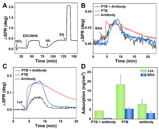 Figure 4. SPR spectrogram monitoring response shifts during the antifouling sensor modification process (A). SPR spectrogram of BSA (B) and lysozyme (C). Statistic column of the adsorption amounts of the modified antibody PTB, PTB, and modified antibody on the bare Au surface (D).