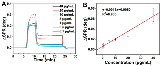 Figure 5. SPR response spectrogram (A) and standard curve (B) of the PA gradient concentration.