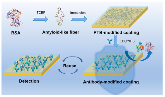 Bovine serum albumin (BSA) has always been deemed an ideal molecule to reduce the interference of nonspecific background in ELISA and Western blotting assays [22]. Though BSA has been cross-linked to create an antifouling electrochemical sensor, it is still rarely used in the construction of antifouling surfaces for SPR sensors [23]. The reason may be due to the weak physical adsorption of BSA on the sensors. Interestingly, the phase-transited BSA (PTB) that can be obtained through a reduction in disulfide bonds has been proven to possess the capability of stable adhesion, as well as good antifouling performance [21,24]. Without any pretreatment, the PTB can easily and stably adsorb on multiple types of substrates and shows an efficient resistance against contaminants, providing an impressive foundation for the construction of antifouling sensors [25,26]. Additionally, abundant groups of BSA could be activated to immobilize recognition ligands to establish specific sensors, though the introduction of ligands may affect the surface structure and the corresponding antifouling performance of the sensors [27]. However, few studies have been conducted on the specific impact of the antifouling capability of modified coatings. Some differentiated effects appeared on the fouling-resistance capabilities of different surfaces when the antibodies were modified on these surfaces [28]. An antibody, as a kind of recognition molecule, is essentially a protein. Just like BSA, we wondered if the immobilization of antibodies on sensor surfaces could also be involved in the antifouling process.
