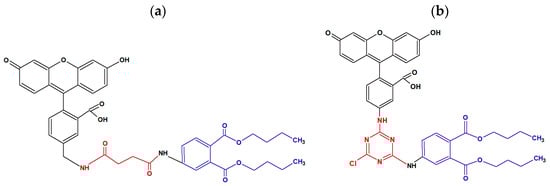 Structures of DBP–AMF (a) and DBP–DTAF (b) tracers. The hapten (DBP) is marked with blue, and the fluorescein is marked with black and spacer between them is red.